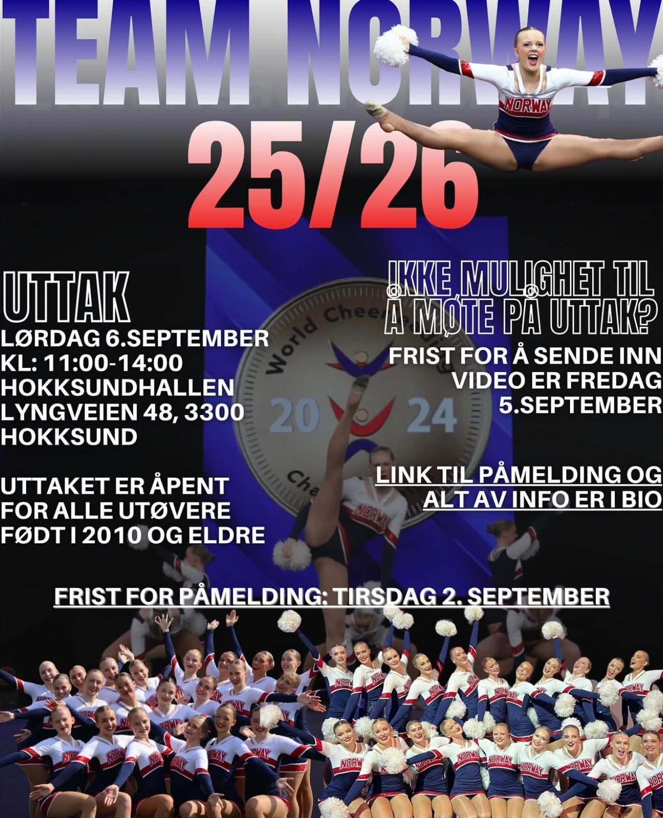 NAIF og Sirens Cheerdance inviterer til uttak for utviklingslandslag i Senior Performance Cheer Pom. Laget skal representere Norge under VM i Orlando i april 2026.