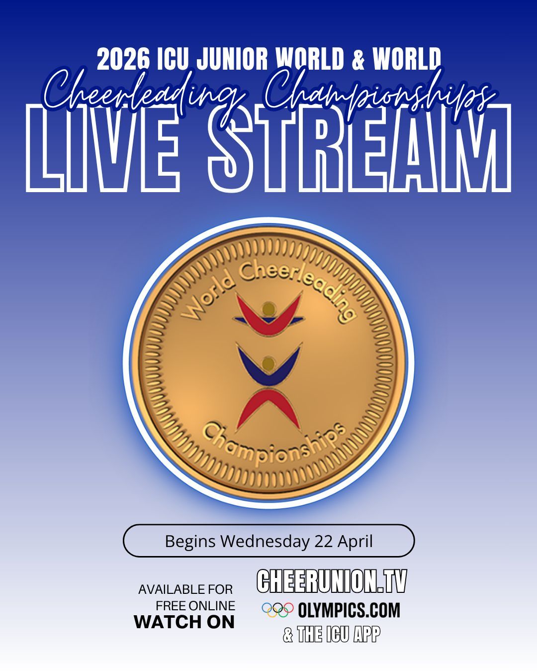 Om du ønsker å følge med på stream, kan de sees på Olympic Channel: https://www.olympics.com/en/sport-events/2026-icu-cheerleading-junior-world-and-world-championships-orlando